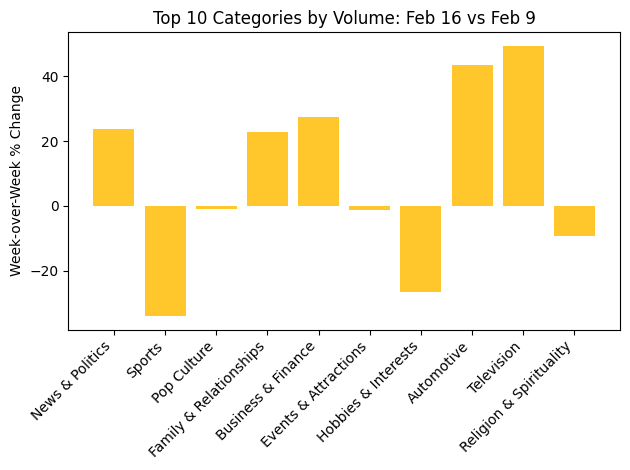 News and Politics increased 24% week over week. The growth was concentrated in procedural and regulatory coverage: